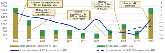 Although the consideration for ATP has not been disclosed, it is likely to be significantly below Stahl’s EUR 2.1bn, reflecting ATP’s smaller scale, narrower market reach, and more focused product offering. Including other possible bolt-on acquisitions, Scope’s estimates assume a combined EUR 3.0-3.5bn acquisition outflow in 2026 – higher than the EUR 1.5bn per year previously built into forecasts for 2025E–2027E. Together, Stahl and ATP generated approximately EUR 725m and EUR 270m in 2025 revenues, respectively. Their combined contribution represents around 5% of Henkel’s group sales and approximately 9% of Adhesive Technologies’ LTM September 2025 sales. Strategically, the two acquisitions are expected to strengthen Henkel’s Adhesive Technologies portfolio by accelerating its expansion into specialty coatings and enabling entry into complementary, higher value end markets.