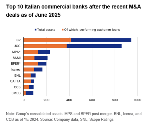 Meanwhile, BPER secured more than 80% of BPSO’s share capital over the summer, paving the way for a full merger by year end. This transaction consolidates BPER’s presence in Lombardy, positioning it as the country’s third-largest bank by customer loans, with total assets of around EUR 200bn and revenues exceeding EUR 7bn. Scope upgraded BPSO’s issuer rating to BBB+/Stable from BBB/Positive on 15 July, reflecting the benefits of its integration into the stronger BPER group.