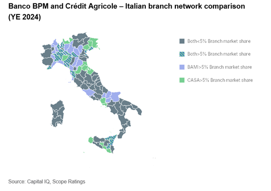 - Their branch networks overlap in Lombardy, Veneto, Tuscany and Sicily, offering the potential for cost cutting, even though both banks have already streamlined their physical presence: -38% by Banco BPM, -30% by Crédit Agricole between 2017 and 2024.