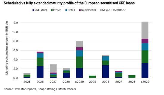 To date, four loans (40%) have been extended and five repaid, while around EUR 5bn of fully extended securitised loans have had their maturities pushed back to 2026, 55% of which by volume are backed by industrial and logistics assets, 20% by office, 19% by retail and the remainder by motor services assets and telecom exchanges.
