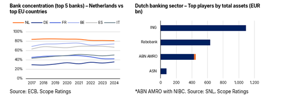 The Dutch banking sector is one of the most consolidated in Europe. The top five banks control over 81% of total banking assets. The announced transaction will not change ABN AMRO’s position as the third largest bank by total assets, though its market shares in key products could slightly increase (19% in new mortgage production as of Q3 2025).