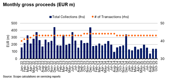 Collections in 2025 to the end of October remain significantly below the historical average. In fact, the downward trend that began in the first half 2023 has worsened in recent months. One factor behind this is seasoning, which tends to exert a stronger impact as portfolios age, further reducing recoveries for the most seasoned deals.