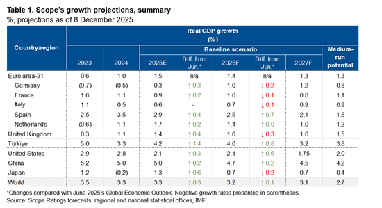 Scope has slightly revised up its global growth estimate for 2025 since June forecasting. The agency now sees global growth of 3.3% for this year before a resilient 3.2% next year (Table 1).