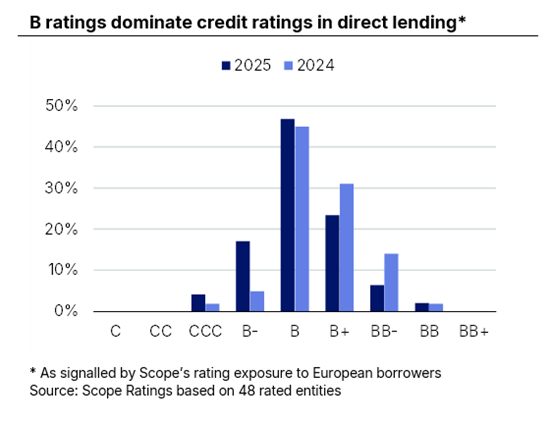 Based on a portfolio of around 50 European companies rated by Scope, the credit risk profile of direct lending borrowers is high: the average rating is in the B category. The borrower universe represents the typical sector split, with the strongest exposures to business and consumer services, TMT, healthcare and financial services.