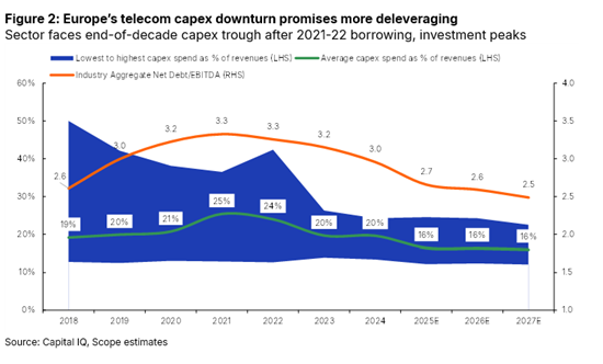 Guidance from Scope’s rated portfolio of 10 European telecoms companies suggests that deleveraging will be a priority. We project that aggregate net debt to EBITDA will fall to around 2.5x in 2027, from 2.7x this year and a peak of 3.3x in 2021/2022.