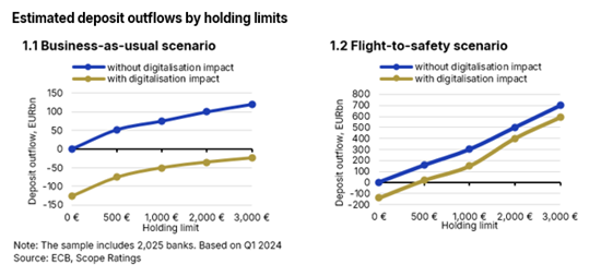 The introduction of the digital euro and euro stablecoins poses clear risks to European banks but it also presents tempting opportunities. ECB simulations indicate that while the digital euro will have a limited impact on bank deposits under normal conditions, deposit outflows could, in a flight-to-safety scenario, be EUR 699bn with a EUR 3,000 holding limit, equivalent to 8.2% of retail sight deposits. On profitability, changes in net interest income are limited in a business-as-usual scenario but the estimated decline in NII is 18bp with a EUR 3,000 limit, excluding digitalisation effects and other potential positive developments.