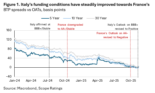 The Negative Outlook that we assigned to France’s AA- long-term ratings on 26 September signals potential further credit rating convergence towards Italy, whose Outlook we revised to Positive on the BBB+ long-term ratings on 31 October. Following France’s downgrade to AA- in October 2024, Italy’s spreads have narrowed significantly to those of France (Figure 1).