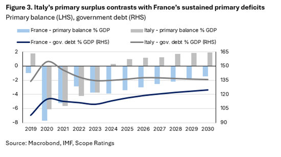 In the near-term and in the absence of shocks, Italy’s fiscal dynamics are more favourable given its primary surplus driven by effective fiscal consolidation, political stability and expected policy continuity possibly after the general election in December 2027.